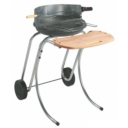 Контейнер очага чугунный, с центральной перегородкой, экономный и практичный, перегородка позволяет раздельное использование отсеков контейнера, легко перемещаемая тележка, рабочая доска с передней стороны, регулирование решетки по высоте, несколько положений для вертела, двигатель и вертел в комплекте поставки.