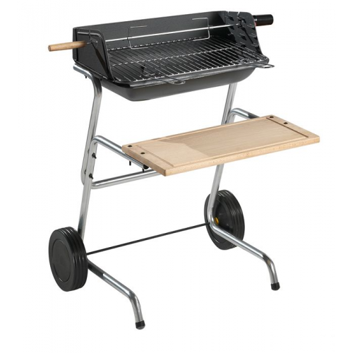 Контейнер очага чугунный, двойного назначения, производительный и функциональный, большая поверхность тепловой обработки, легко перемещаемая тележка, рабочая доска с передней стороны, отдельная решетка для разогрева пищи, регулирование основной решетки по высоте несколько положений для вертела, двигатель и вертел в комплекте поставки.