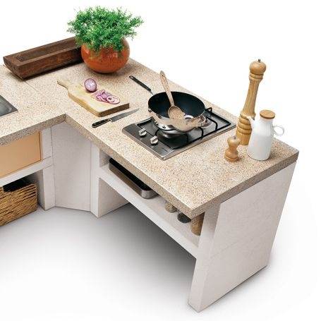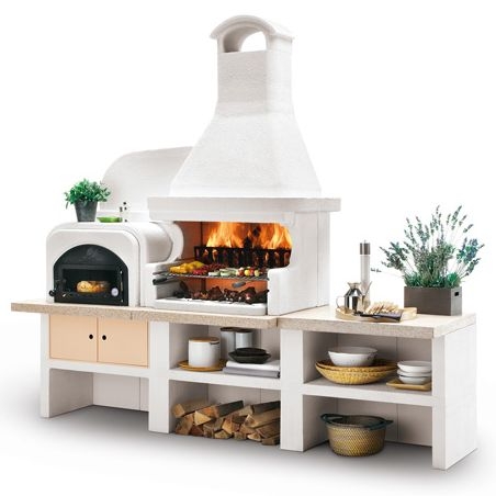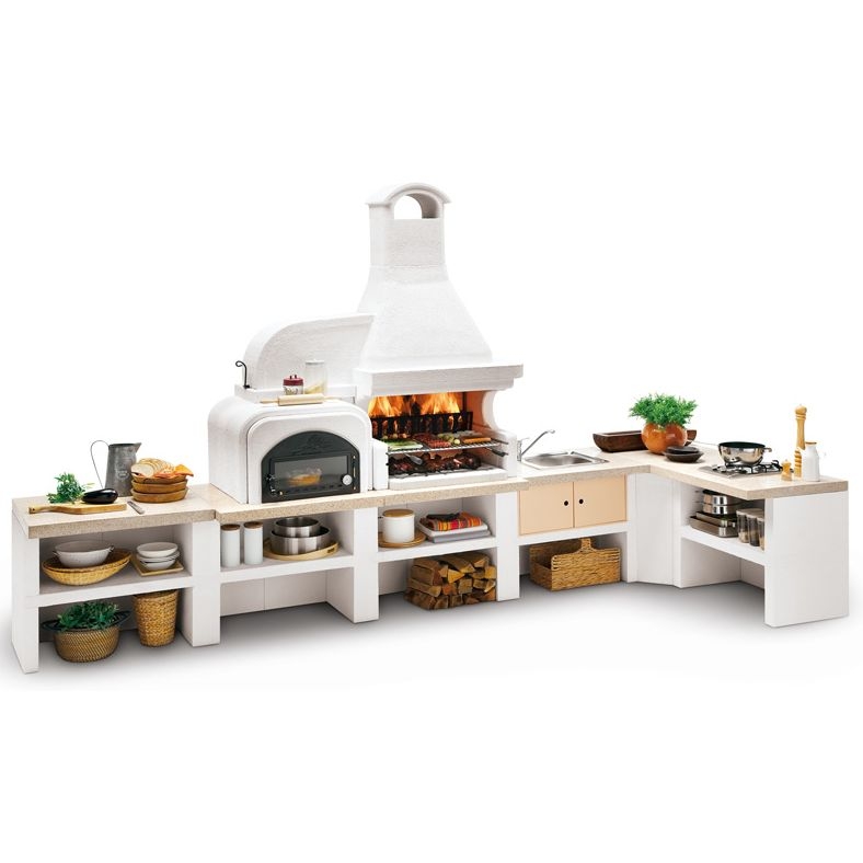 Выполнена из совместимых модулей. Столешница из полированного камня Marmotech. Основания всех модулей имеют заднюю стенку. Стальная решетка для дров и решетка из нержавеющей стали 76х40 с бакелитовыми ручками. Общие размеры: 450х85х218 см.