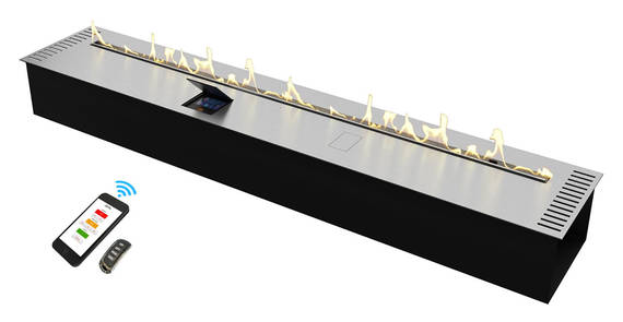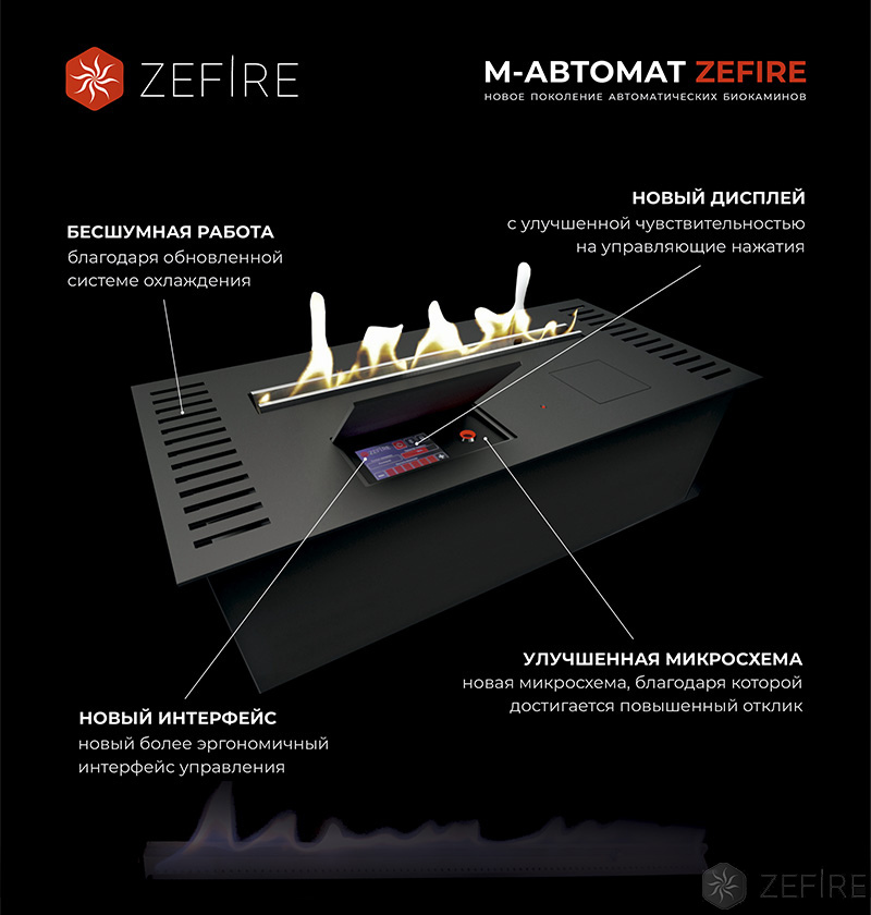 Автоматический биокамин Zefire Automatic 1600 является настоящим прорывом в современном производстве. Благодаря специальной технологии управлять прибором можно при помощи смартфона, планшета или другого гаджета. При этом такое устройство совершено безопасно в использовании, не выделяя запаха, гари и дыма. В случае возникновения любых аварийных ситуаций камин отключается автоматически. Что касается его охлаждения, то за это отвечают встроенные кулеры. Линия огня: 1400 мм.