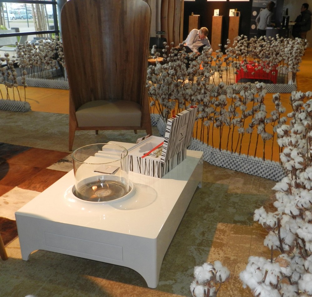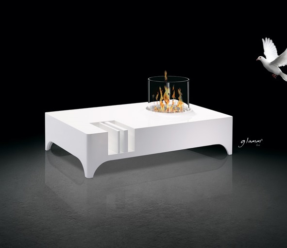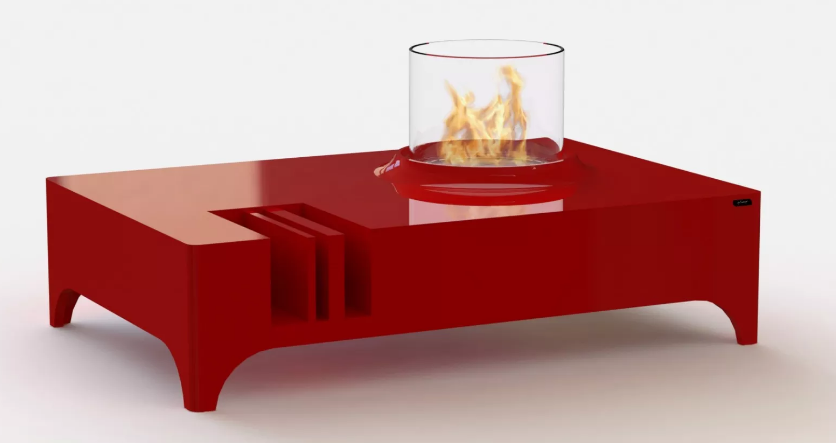 Дизайн напольного биокамина GlammFire Vulcanu вдохновлен внешним видом кратера вулкана. Разместив журналы и газеты в специально предназначенных для этого отделениях в облицовке камина, можно получить необходимые акценты.