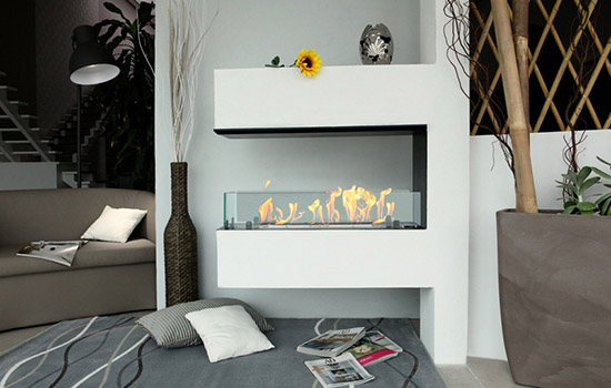 BKBF-T встраиваемый фронтальный трехсторонний биокамин для украшения солидной стены.