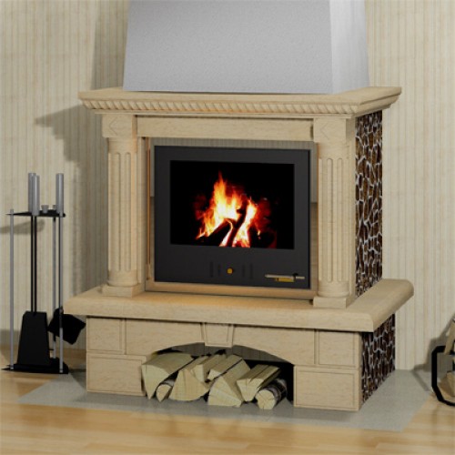 Каминная облицовка Муза 600 изготовлена из камня META Stone™ (бежевого цвета). Вставки в боковые панели выполнены из пеноблока и подготовлены для последующей отделки (может использоваться любая отделка, толщина материала не более 30 см). Отделочный материал в комплект не входит.
