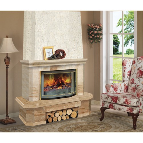 Облицовка изготовлена из полированного мрамора. Балка из массива дуба. Подходит для топок с панорамным и призматическим стеклом.