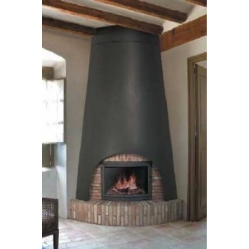 Угловой камин с круглым основанием и закладными деталями из кирпича со швом. Металлический короб конической формы черного цвета (высота от пола до потолка 2,60 м) и чугунная топка с круглым стеклом Premier Curvo.