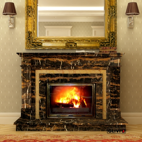 - Камин выполнен из полированного мрамора Black and Gold, Crema Valencia.