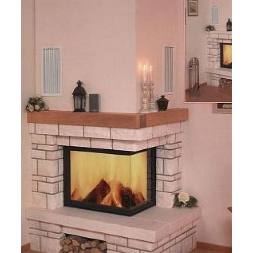 Камин Hark Rustico 20N. Угловой камин из колотого натурального камня Sandstein bossiert, Untersims Sandstein geschliffen. Столешница из полированного натурального камня. Деревянная каминная полка.