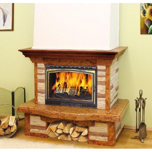 Облицовка из натурального камня: полированные элементы - Rosso Verona, колотые элементы песчаник. Балка выполнена из дуба, натурального цвета. Вариант прямой либо угловой. Подходят под эту облицовку топки: шириной 700 мм с прямым стеклом.