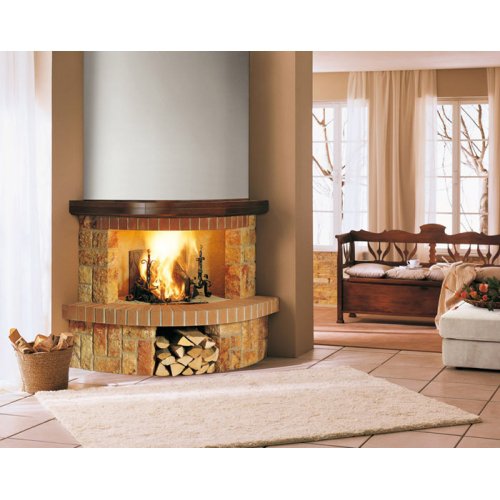 Угловой камин Palazzetti Monaco из мрамора Soleado, столешница из шамотного кирпича, каминная полка под орех.
