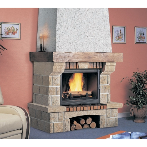 Дровяной камин, выполненный в стиле кантри. Портал облицован песчаником Gard и мрамором. Декоративная балка из массива дуба. Чугунная топка с прямым термостойким стеклом.