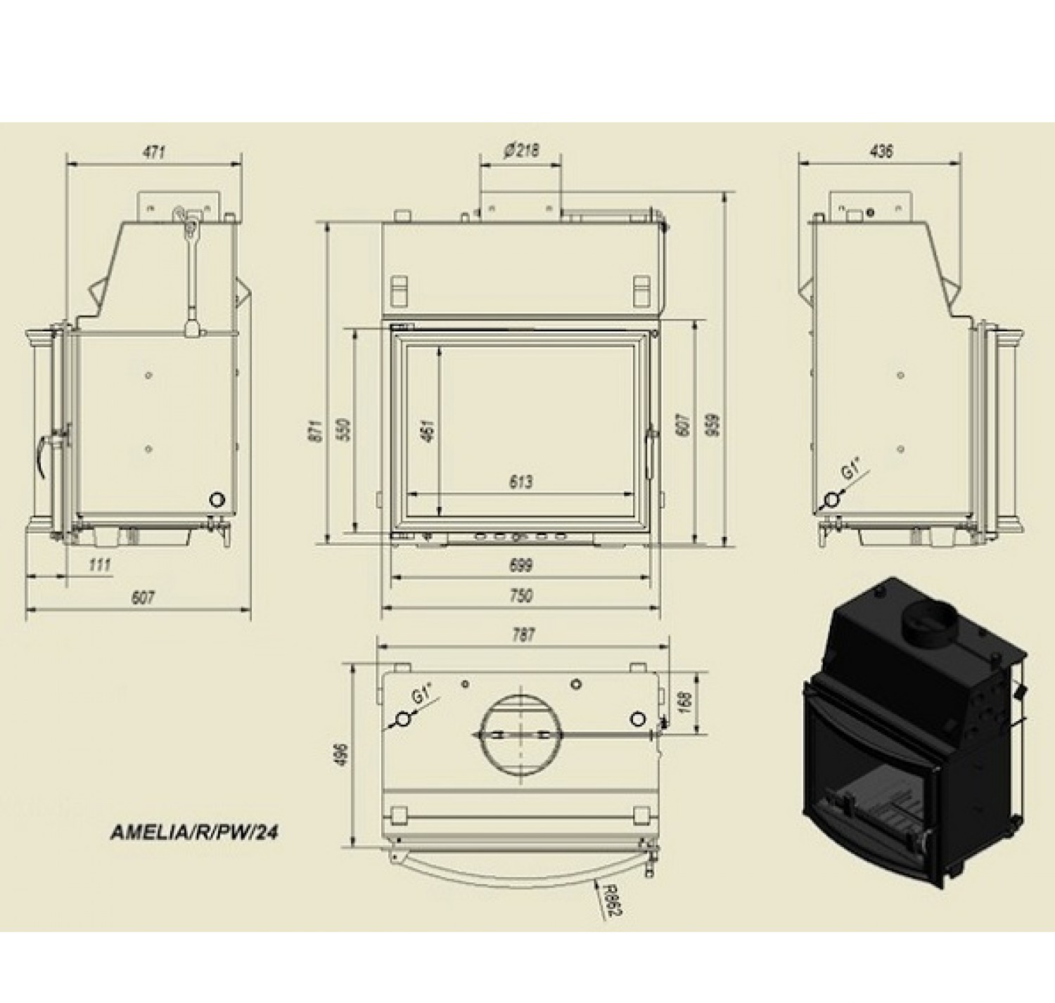 Каминная топка Amelia/R/PW/24 с водяным контуром
