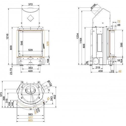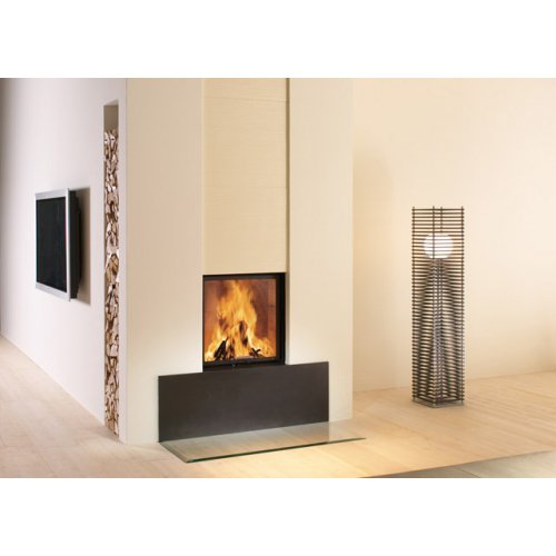 Стальная топка со сферическим стеклом. Боковое открывание двери. Ширина дверки 525 мм, высота - 546 мм. Возможно подключение воздуха из-вне.
