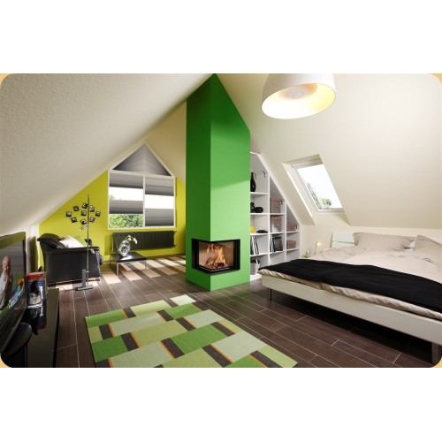 Угловая каминная топка с цельным Г-образным стеклом. Дверца с подъемным механизмом (система Easy-Lift). Топочная камера футерована шамотом. Ширина дверки 506/506 мм, высота - 485 мм. Возможно подключение воздуха из-вне.