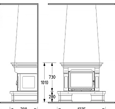 Подъемная дверца с жаропрочным стеклом, что позволяет наслаждаться открытым огнем, которая открывается на петлях для чистки. Стальной кожух и внутреннее основание из чугуна обеспечивают прочность и долговечность. Имеет современный дизайн.