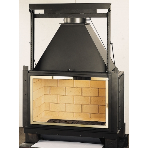 Горизонтальная топка с подъемным механизмом двери. Благодаря большой мощности, такая топка способна отапливать большие помещения и сохранять тепло на протяжении длительного времени. Стенки очага защищены шамотом. Дверь с прямым керамическим стеклом, устойчивым к высоким температурам. Параметры: Ширина 1160 mm Глубина 660 mm