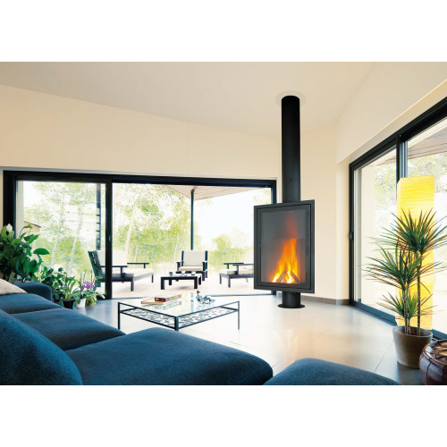Пристенный вариант центральной модели Filiofocus - это единая самоподдерживающаяся конструкция. Она оснащена 3 изогнутыми пирокерамическими стеклянные дверцами, одна из которых открывается. Камин может стоять на полу или быть приподнятым на стальном основании (дополнительная опция). Теплообменник, располагающийся сзади топки, занимает 2/3 кожуха и обеспечивает исключительную площадь теплообмена.