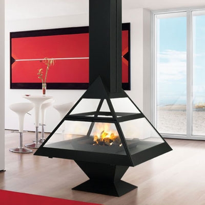 Центральный камин с двумя стеклянными дверцами, с подножием и телескопическим элементом. Цвет - черный. Камин разработан для панорамного обзора огня при установке в любое место помещения.