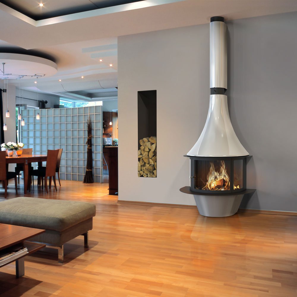 Фронтальный полукруглый дровяной камин Lorena для создания стильных изысканных интерьеров и оптимального отопления помещений. Компания Traforart, как и обычно, удивляет своих клиентов новаторством конструкторской и дизайнерской мысли. Камин LORENA имеет необычную полукруглую, и очень гармоничную и практичную конструкцию. Длинный элегантный дымоход плавно переходит в верхнюю полукруглую часть камина. Ниже идет сам очаг – застекленный и с удобными дверцами и просторными стеклами, которые открывают потрясающий вид на игру пламени с любой стороны. Заключительная нижняя часть, аналогичная по форме с верхним и топочным элементом камина, имеет удобную выступающую полку по всей окружности, которая выполняет как декоративные, так и практичные функции.
