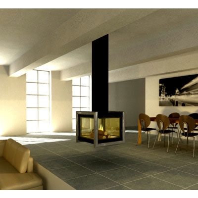 Фиксированный или вращающийся центральный камин Don-Bar (Бельгия) на дровах с асимметричной рамкой. Исполнение рамок возможно в черном, титановом и серебряном цвете без наценки.