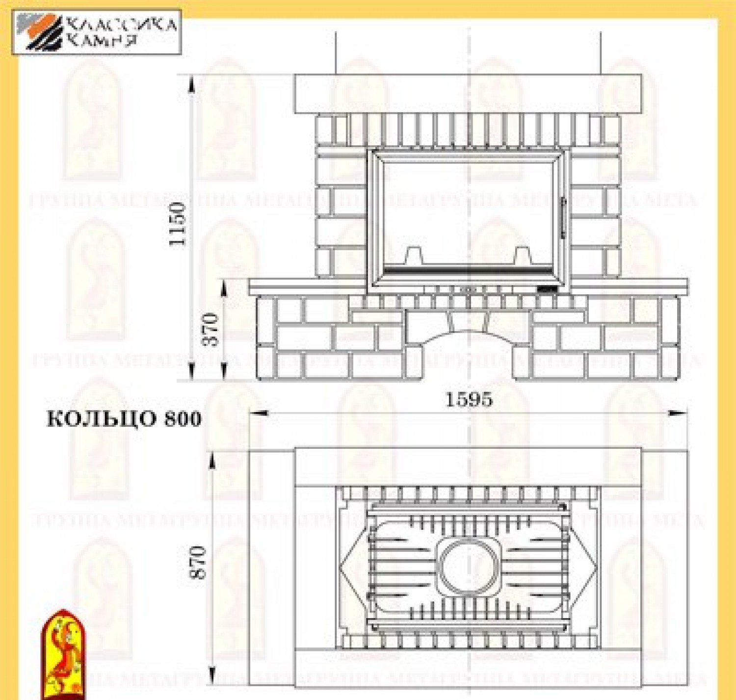Облицовка Мета КОЛЬЦО 800 изготовлена из натурального мрамора теплого бежевого оттенка с обработкой искусственного старения в сочетании колотого доломита жёлтого цвета и травертина светло-коричневого цвета. Предтопочная и надтопочная часть выложена шамотом песочно-жёлтого цвета. Каминная балка изготовленная из МДФ и покрытая шпоном дуба, послужит отличной полкой для каминных аксессуаров. В нижней части камина расположена удобная ниша для хранения и сушки дров.