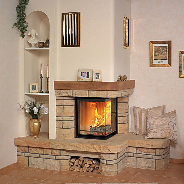 Угловой камин из натурального камня Sandstein bossiert + деревянная балка.