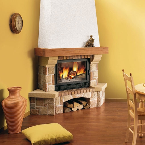 Угловой камин. Изготовлен из разноцветного бута + камень Castillon + балка из экзотического дерева Iroko.