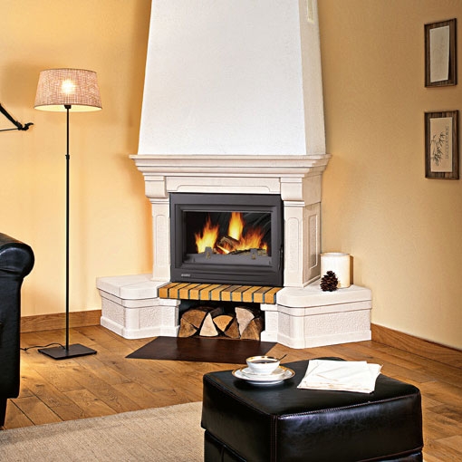 Угловая облицовка. Изготовлена из белого Edelroc + каминная плита из огнеупорного кирпича.