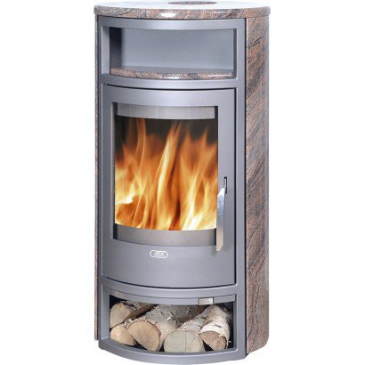Также в этой печи предусмотрены система двойного дожига, система чистое стекло и функция медленного горения. Под топкой внизу расположена ниша для хранения дров, а над топкой — ниша для разогрева пищи.
