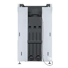 Металлическая отопительная печь-камин. Ввод наружнего/первичного воздуха. Облицовка для топки из нержавеющей стали. Вертикальная полоска-инкрустация из нержавеющей стали. Поднимающаяся и открывающаяся классическим способом дверца. Цвет RAL 8017.