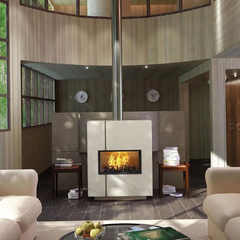 Металлическая отопительная печь-камин. Ввод наружнего/первичного воздуха. Облицовка для топки из нержавеющей стали. Вертикальная полоска-инкрустация из нержавеющей стали. Поднимающаяся и открывающаяся классическим способом дверца. Цвет RAL 1013.