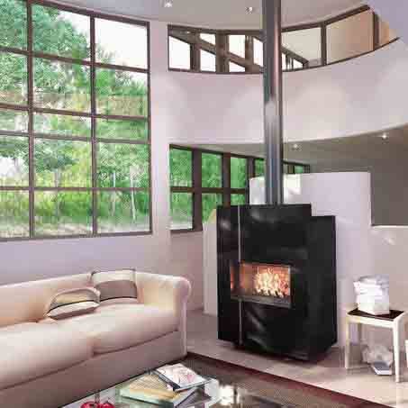 Металлическая отопительная печь-камин. Ввод наружнего/первичного воздуха. Облицовка для топки из нержавеющей стали. Вертикальная полоска-инкрустация из нержавеющей стали. Поднимающаяся и открывающаяся классическим способом дверца. Цвет RAL 9005.