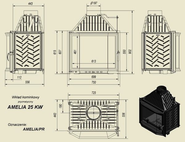 Топка изготовлена из толстого чугуна, ширина стенки 8-10 мм. Благодаря конструкторским особенностям увеличен нагрев поверхности вставки. Дровяная топка Ameliа имеет призматическое термостойкое стекло, способное выдержать температуру до 800 градусов Цельсия.