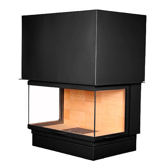 Каминная топка черного цвета, с очагом, облицованным специальным огнеупорным камнем.
