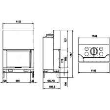 Каминная трехсторонняя топка с очагом, облицованным специальным огнеупорным камнем. Цвет черный, кирпичи - серого цвета.