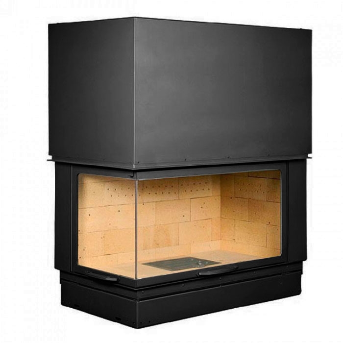 Угловая левая каминная топка со стеклом 16/9. Дверцу топки можно открывать вбок за один прием.