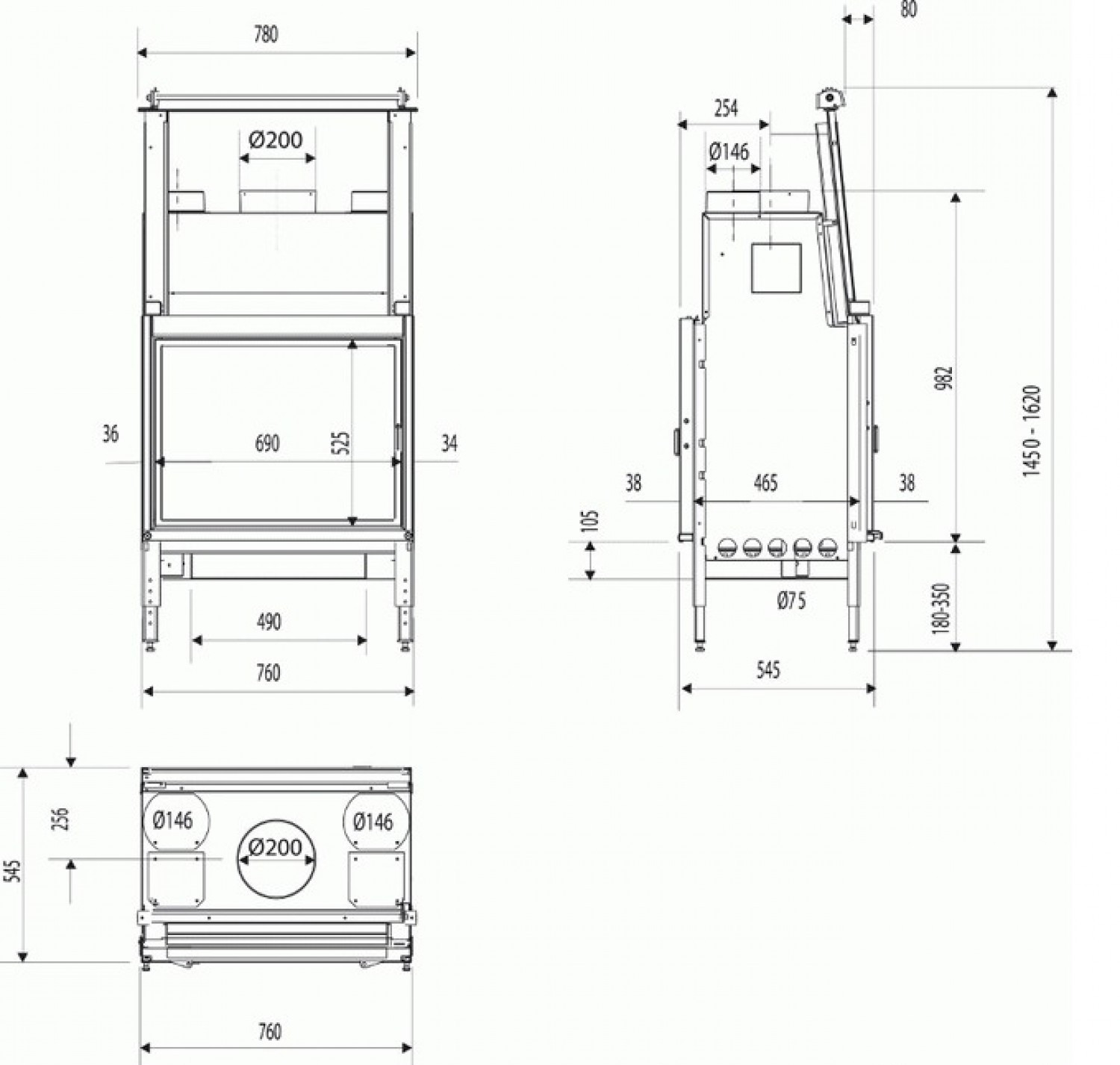 2 застекленные дверцы, обе с боковым открыванием + одна с подъемом, распр. воздуха (2 патрубка), рамка дверцы - хром.