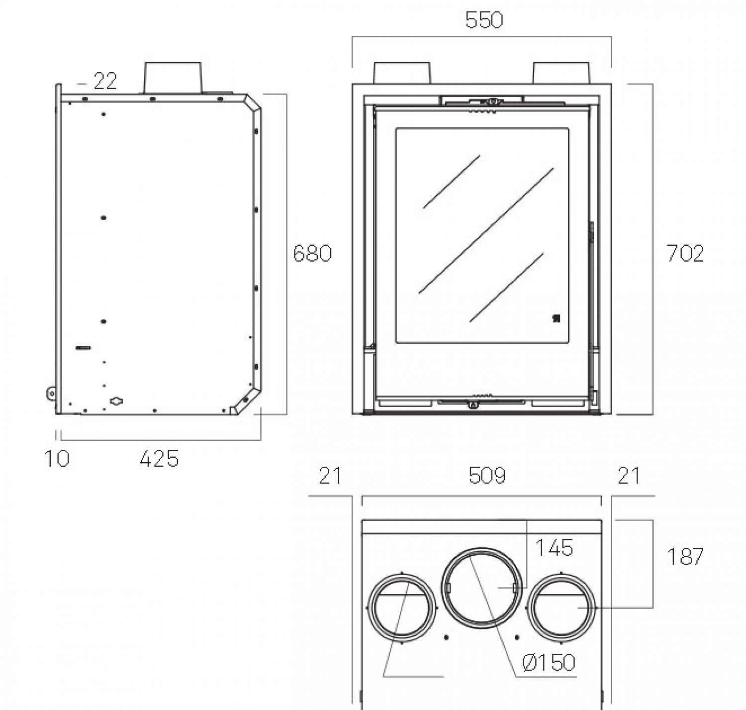 Стальной вертикальный инсерт с первичным и вторичным регистром подачи воздуха, благодаря чему перед попаданием в очаг воздух сначала прогревается.