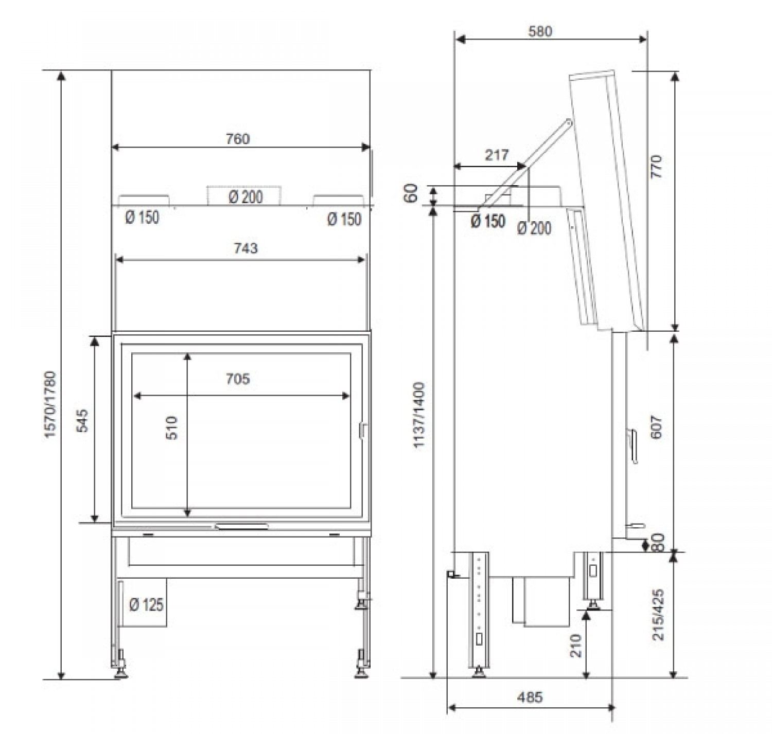 Универсальная топка изготовлена из чугуна, футирована шамотным кирпичом. Плоское стекло. Подъемная дверца.