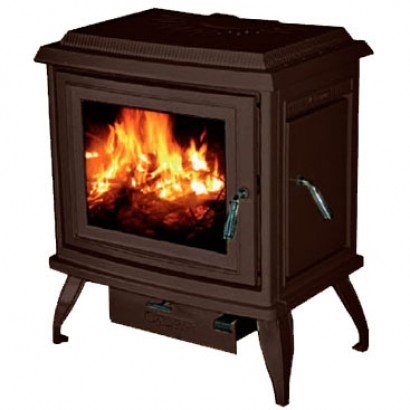 Печь с фронтальной и боковой дверцами, имеет систему Чистое стекло, ручка дверцы не нагревается в процессе топки. Печь покрыта эмалью, цвет - коричневый.