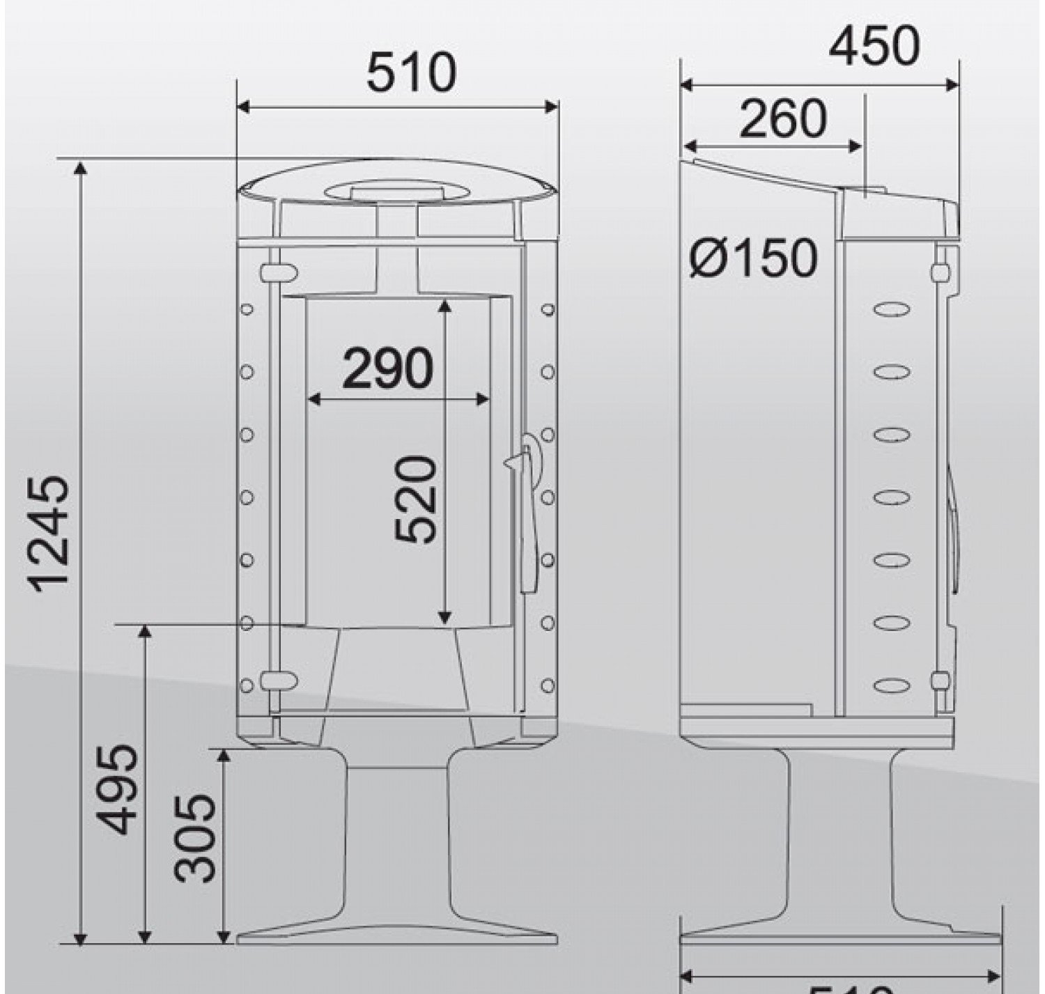 Круглая чугунная печь, закругленная нога, вертикальная или горизонтальная загрузка дров.