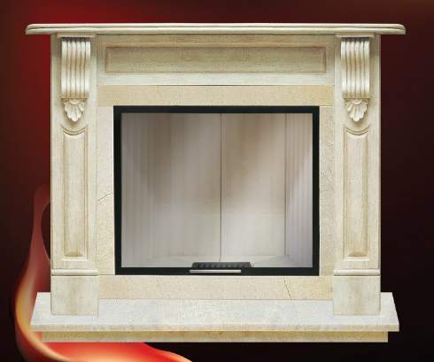 Фронтальный камин под дровяную топку с прямым стеклом. Облицовка выполнена в классическом стиле, декорирована резными колоннами.