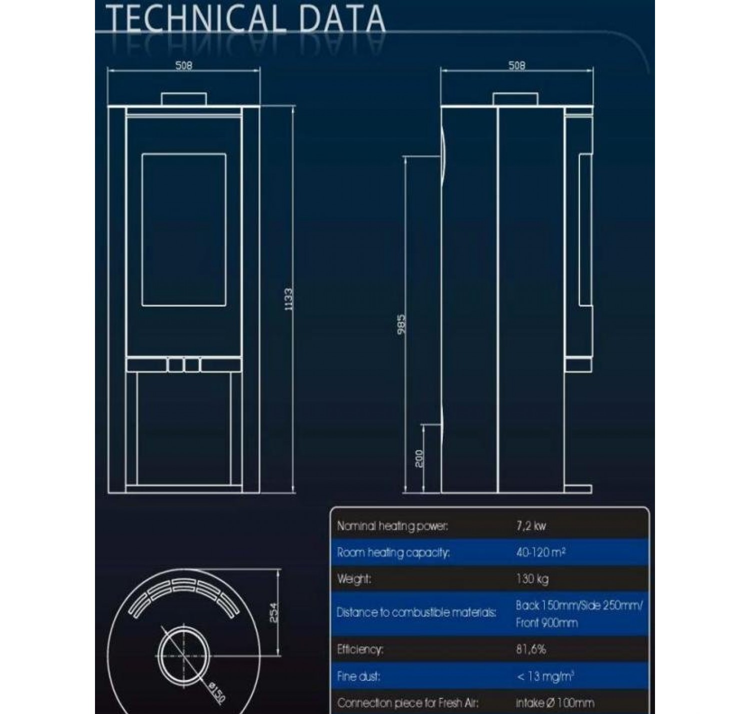 - Диаметр дымохода, (мм) 150 мм.