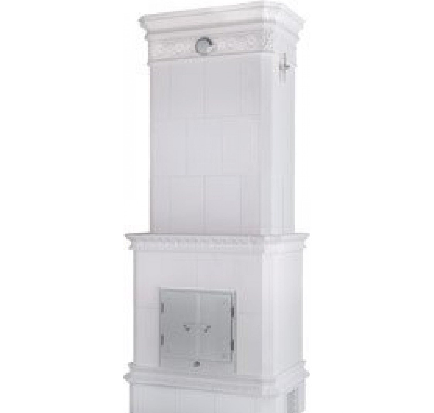 Орнамент, украшающий верхнюю плитку, полочку и плинтусы этой гладкой печи, вдохновлён мотивами античности.