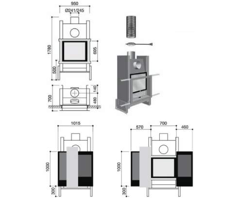 Две стальные дверцы фасада раздвигаются вручную. Цвета фасада нельзя изменить. Дверца из пирокерамического стекла открывается сбоку телескопически. Топка выложена внутри огнеупорным кирпичом. Верхние и нижние вентиляторы обязательны.