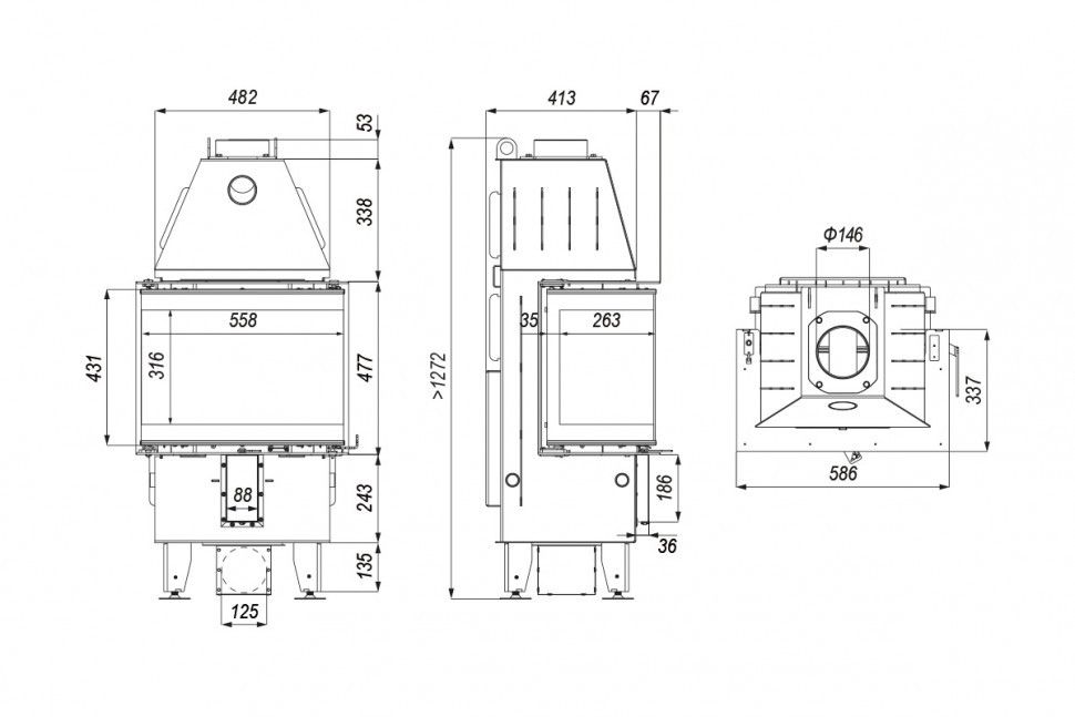 Имея небольшие габаритные размеры, демонстрирует хороший обзор огня при горении. П-образная дверца камина оснащена тремя составными жаростойкими стеклами, усилена в углах дополнительными пластинами жесткости и имеет только боковое открытие.