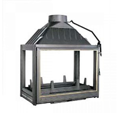 - Каминная топка с двумя стеклянными панелями, сопоставленными друг напротив друга под прямым углом (стеклянные панели соединены без рамы).