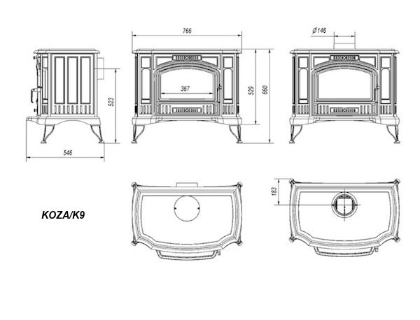 Чугунная печь с номинальной толщиной стенок 8 мм! К дровяной печке Koza/K9 дымоход можно подводить сверху и сзади. Необычный внешний вид с 3-мя стеклами. Реуглировка поступающего на горение воздуха с помощью рычажка.