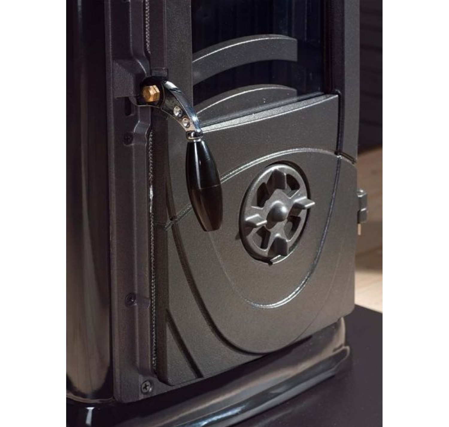 - Панорамная дверь, которая позволяет легко загружать топливо и наслаждаться игрой живого пламени.