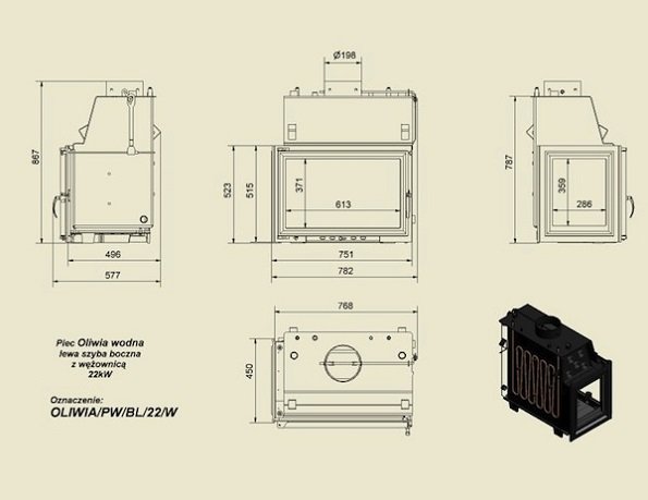 Мощная каминная вставка со встоенным теплообменником объемом 46,5 литров. Топку Oliwia/PW/BL/22 можно использовать в качестве котла отопительной системы. У топки имеется глухое боковое стекло слева. Внутренние части топочной камеры чугунные, а корпус выполнен из толстой стали.