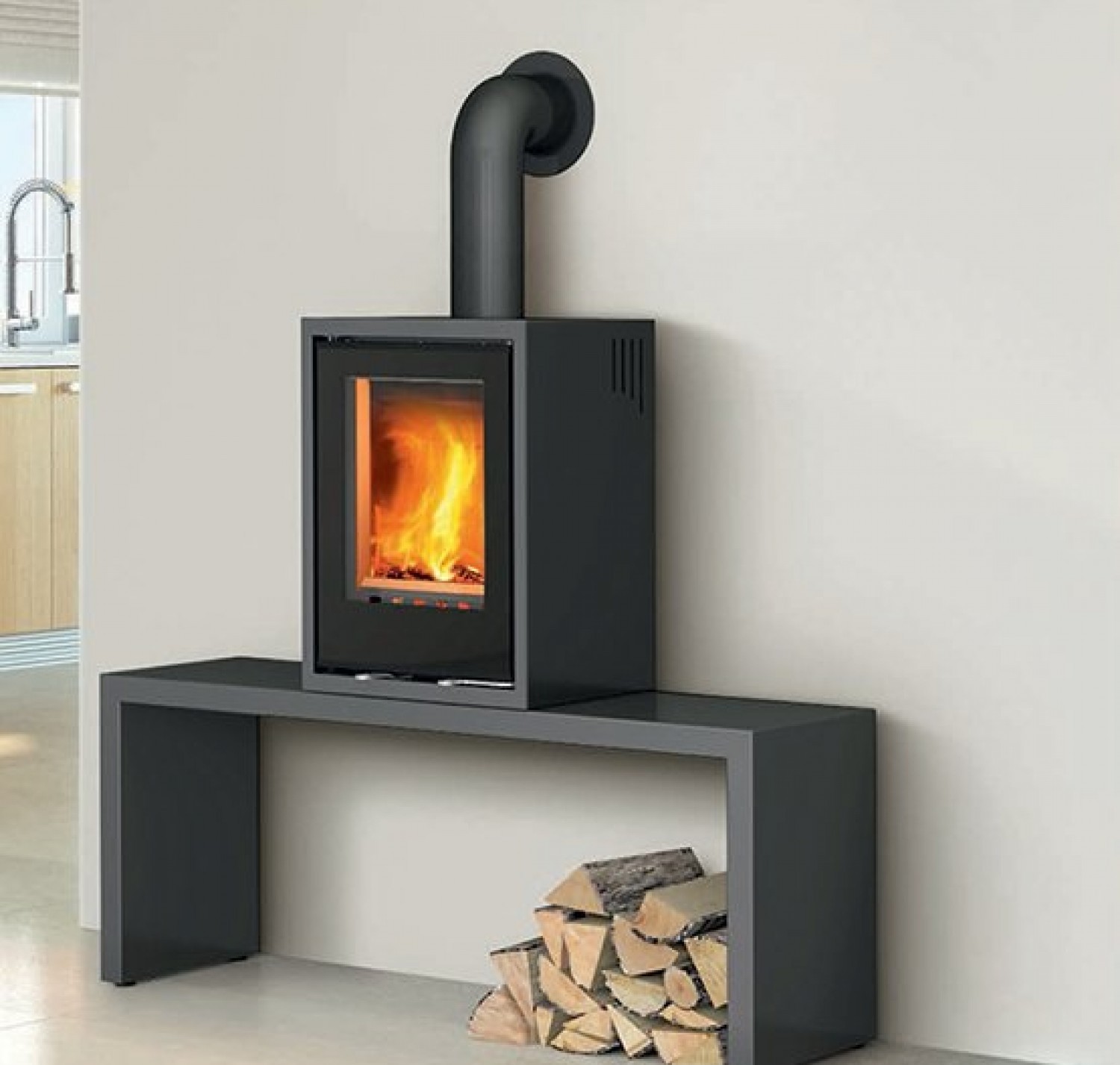 Данная печь может служить как вставкой в портал или каминную облицовку, так и отдельностоящей печью - для этого дополнительной опцией к этой печи предлагается приобрести базовые столешницы.